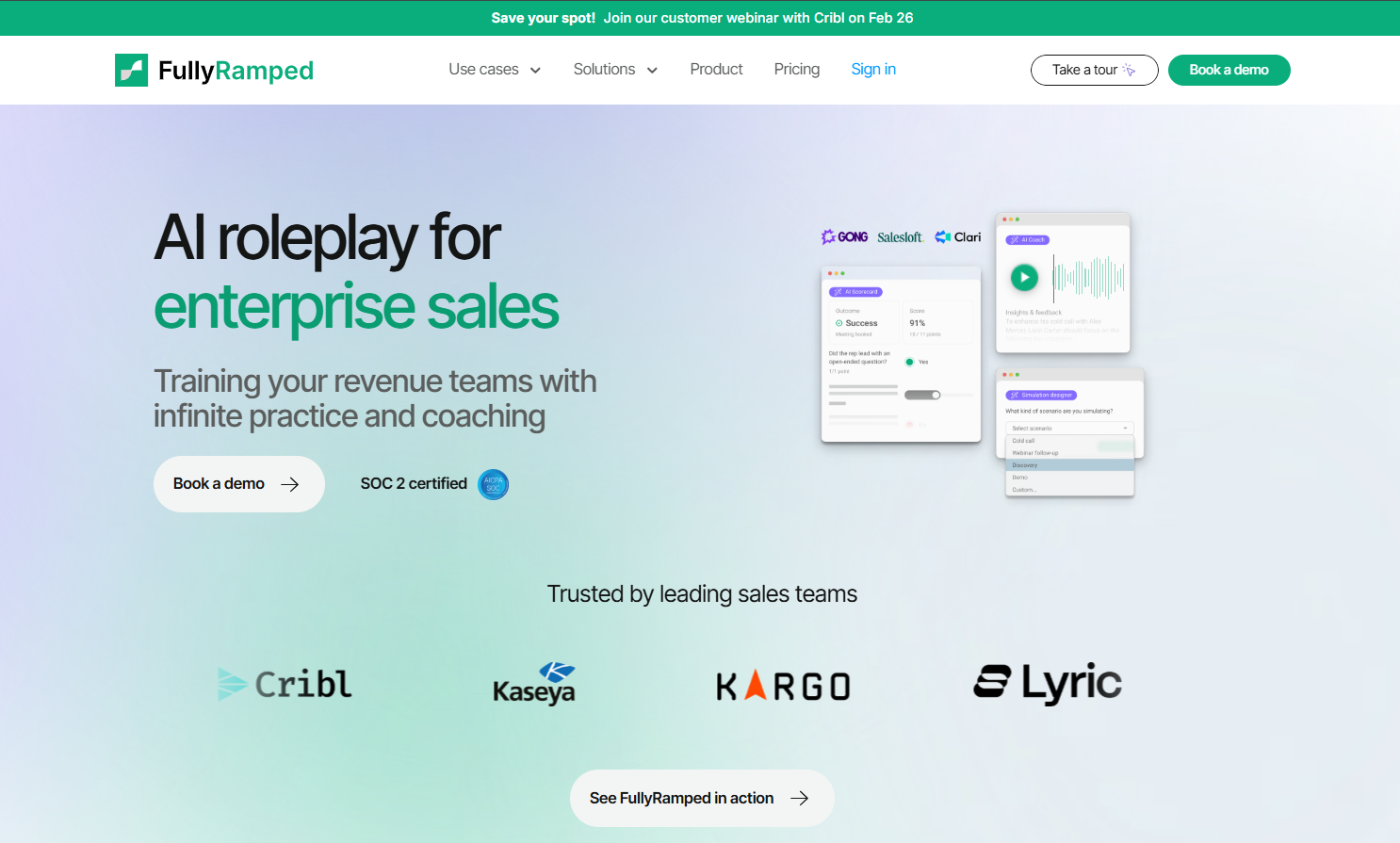 FullyRamped is used by sales and enablement leaders to accelerate onboarding and standardize coaching at scale. Its focus is on repeatable, voice-driven rehearsal that builds confidence before live pipeline conversations.
