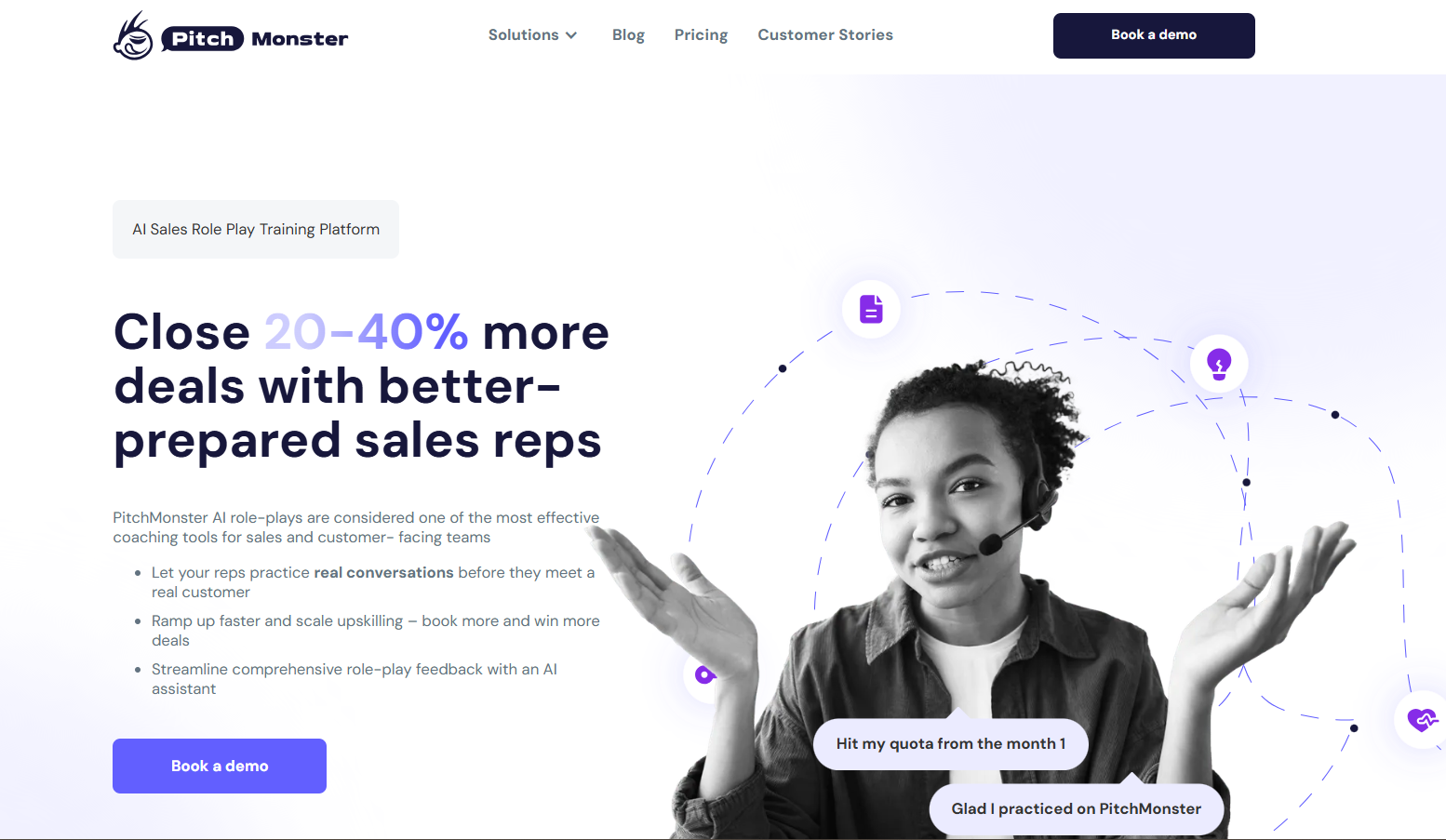 PitchMonster is an AI-powered sales role-play training platform that helps sales reps rehearse real sales conversations before they talk to live customers. It provides AI-driven role-play simulations for cold calls, discovery meetings, demos, pitch delivery, and objection handling.